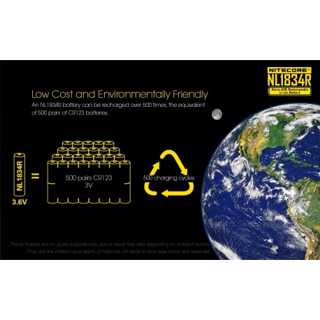 Akumulator zastępuje dwie baterie CR123, ale jest odrobinę dłuższy i szerszy od dwóch baterii CR123. Jest w 100% kompatybilny z produktami Nitecore, ale może nie pasować do urządzeń innych producentów.
