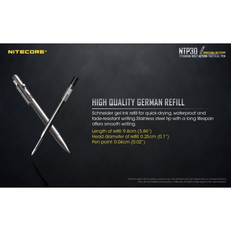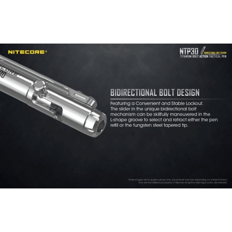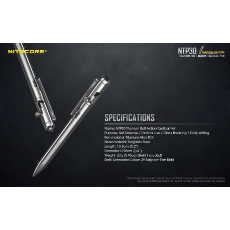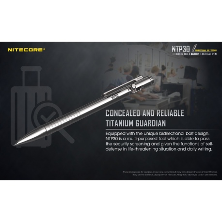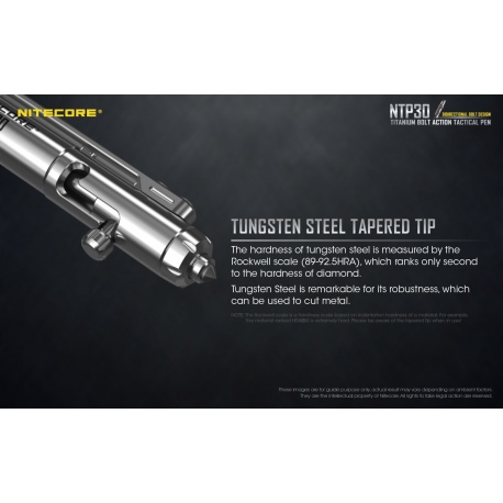 Nitecore NTP21 to coś więcej niż zwykły długopis do pisania. Końcówka z wolframu idealnie nadaje się do zbicia szyb w kryzysowej sytuacji bądź do ochrony osobistej w razie niebezpieczeństwa. Obudowę długopisu wykonano ze stopu tytanu TC4, jest przez to twarda i lekka a jednocześnie posiada idealną ochronę przed korozją i zużyciem.