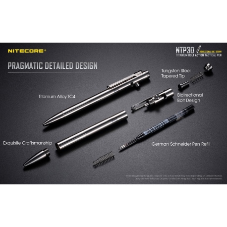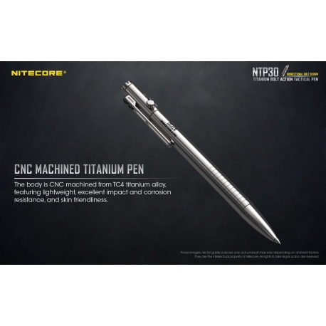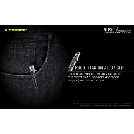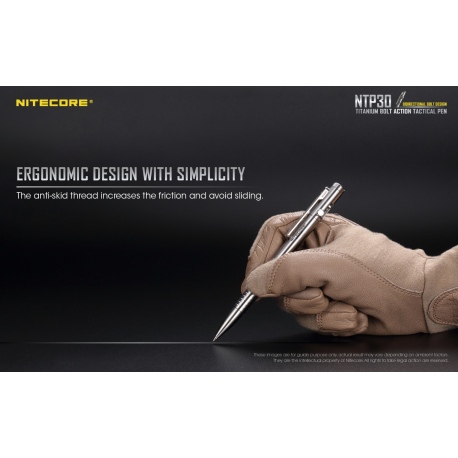 Zaprojektowany jako wygodne narzędzie codziennego użytku. Obudowa posiada antypoślizgową powierzchnię zapewniającą dobry chwyt. Klips mocujący z tytanu pozwala na łatwe przymocowanie długopisu do kieszeni, koszuli czy plecaka. NTP30 waży zaledwie 26.9 g i mierzy 132 mm długości, smukły i gładki stanowi idealny dodatek do codziennego wyposażenia.