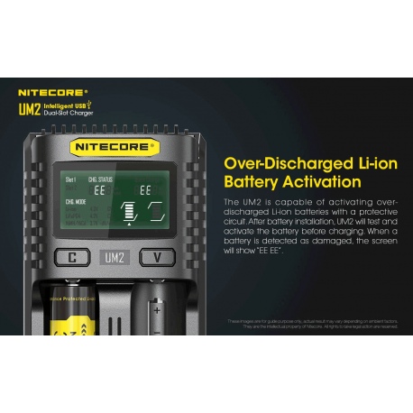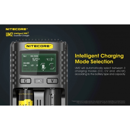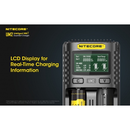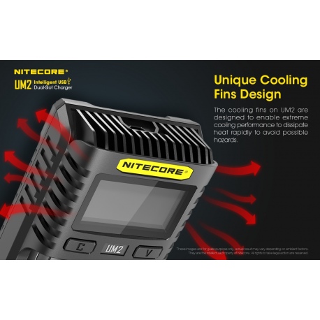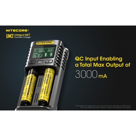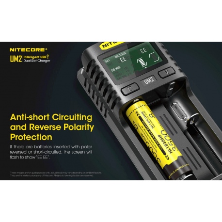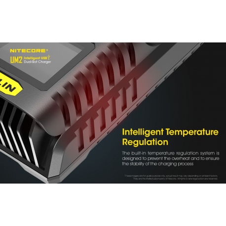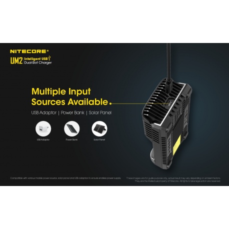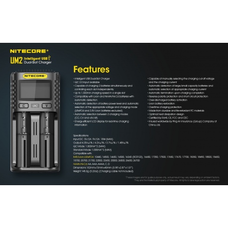 Nitecore UM2 to inteligenta ładowarka dedykowana do akumulatorów w technologii IMR/Li-Ion/LiFePO4 oraz Ni-MH/Ni-Cd w różnych rozmiarach i pojemnościach. Zastosowane oprogramowanie układowe pozwala na optymalne ładowanie dwóch akumulatorów na raz. Wyświetlacz LCD w czasie rzeczywistym informuje użytkownika o statusie ładowania i stanie akumulatorów. Dzięki zastosowaniu gniazda USB, ładowarka może być zasilana z adapterów, powerbanków czy outdoorowych paneli słonecznych. Obudowa UM2 jest wykonana z trudnopalnego materiału, odpornego na uderzenia oraz posiada radiatory ułatwiające odprowadzanie ciepła. UM2 jest świetnym wyborem dla miłośników outdooru, strzelectwa, fotografów, filmowców.