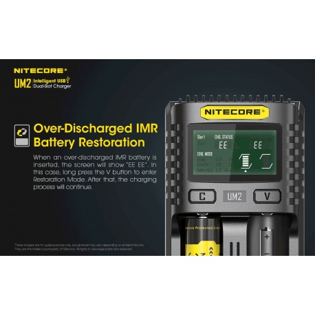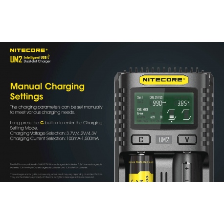 Dzięki zastosowaniu inteligentnego oprogramowania układowego ładowarka UM2 automatycznie wykrywa rodzaj akumulatorka i zastosowuje właściwy tryb ładowania. Użytkownik ma możliwość zmiany nastawy i wyboru trybu pracy ładowarki, dostosowując prąd ładowania do posiadanego akumulatorka. UM2 wspiera wiele rodzajów ogniw, min. li-ion/imr/lifep04/ni-cd/ni-mh oraz popularne rozmiary 18650, 16340, 14500.