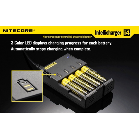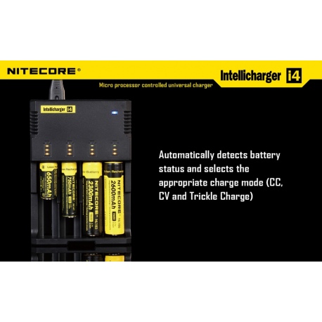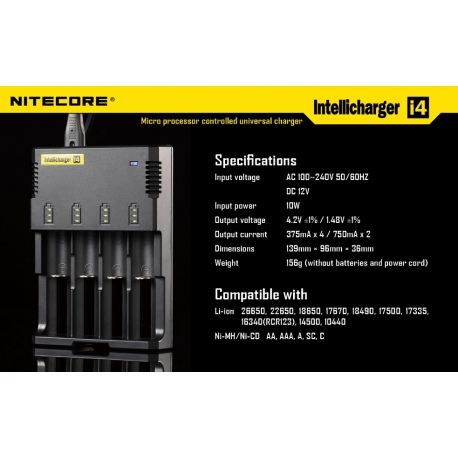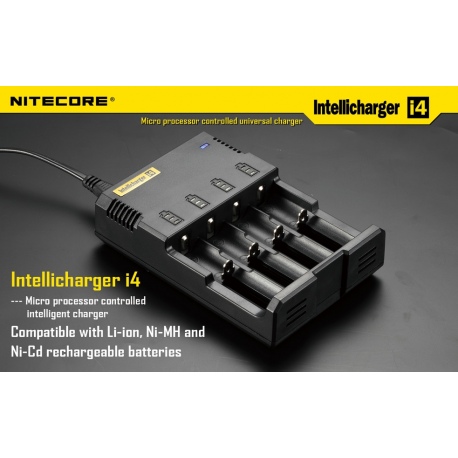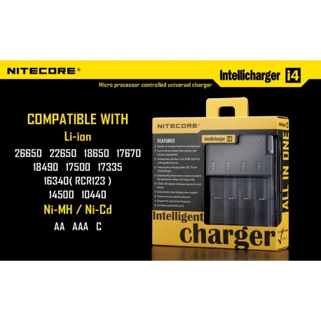 Ładowarka Intellicharge i4 V2 to druga i najnowsza wersja uniwersalnej ładowarki mikroprocesorowej przeznaczonej do ładowania większości typów akumulatorów – 3.7V Li-ion (litowo-jonowych): 10440(AAA), 14500(AA), ICR123 (RCR123), 16340, 18350, 18500, 18650, 17670, akumulatorów Ni-MH oraz Ni-Cd.
