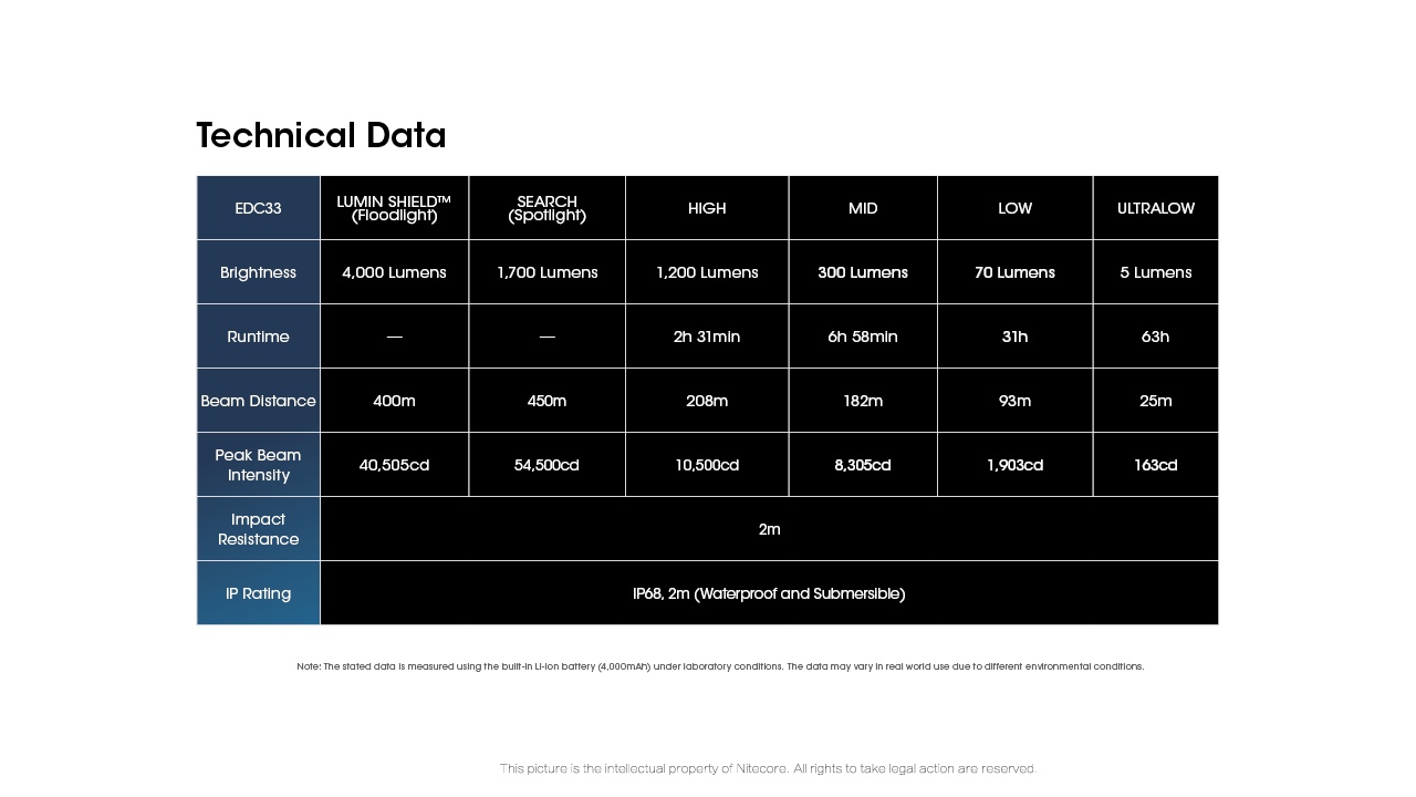 Latarka taktyczna EDC33 o bardzo dużej mocy – 4000 lumenów (tryb specjalny do samoobrony: LUMIN SHIELD™).
