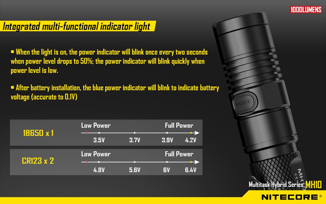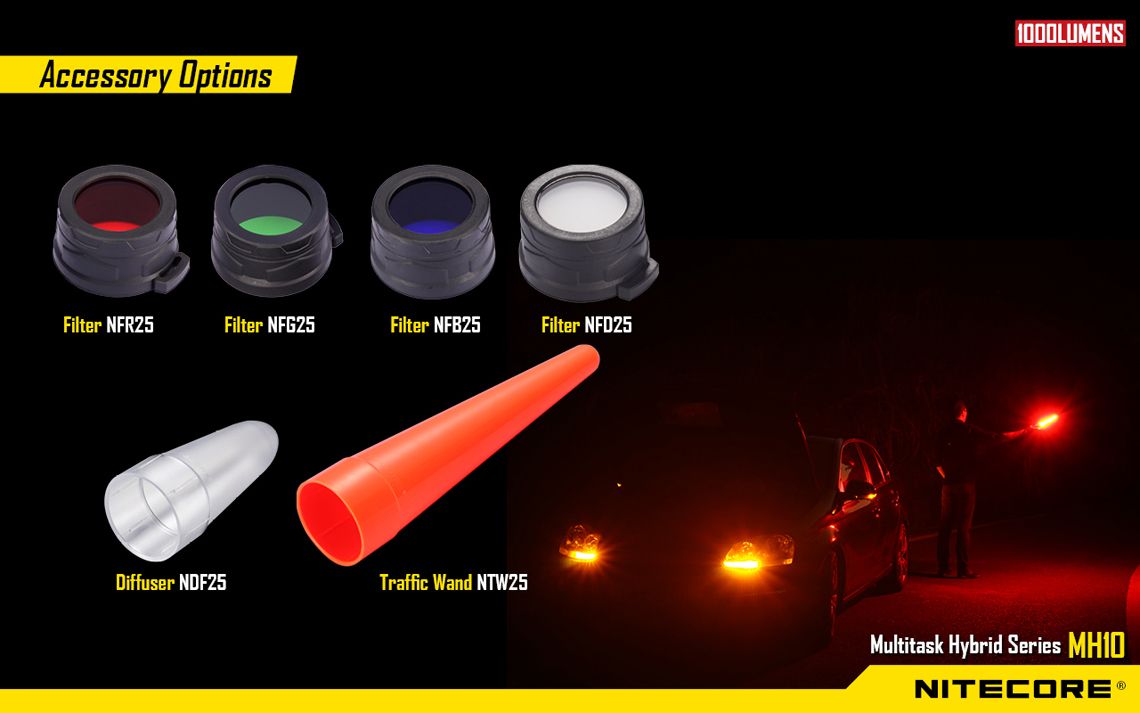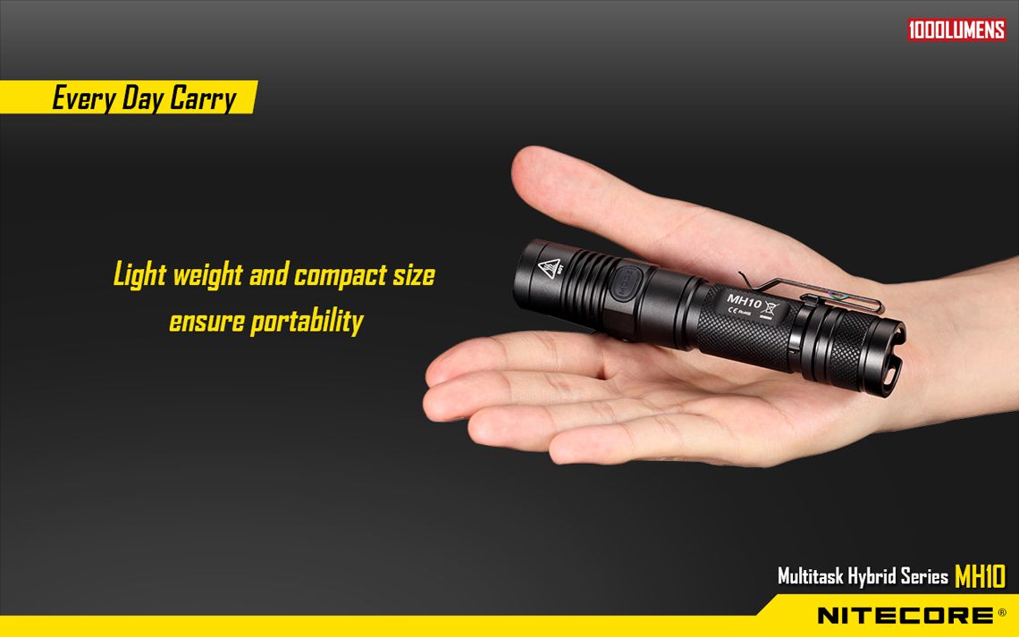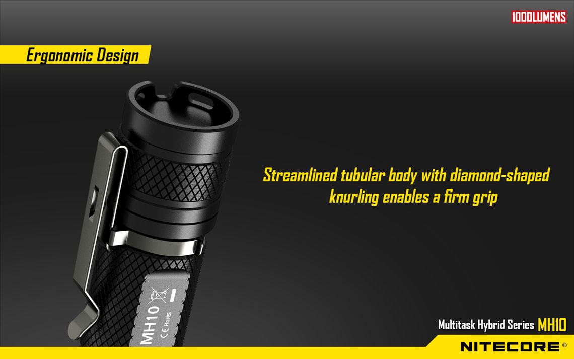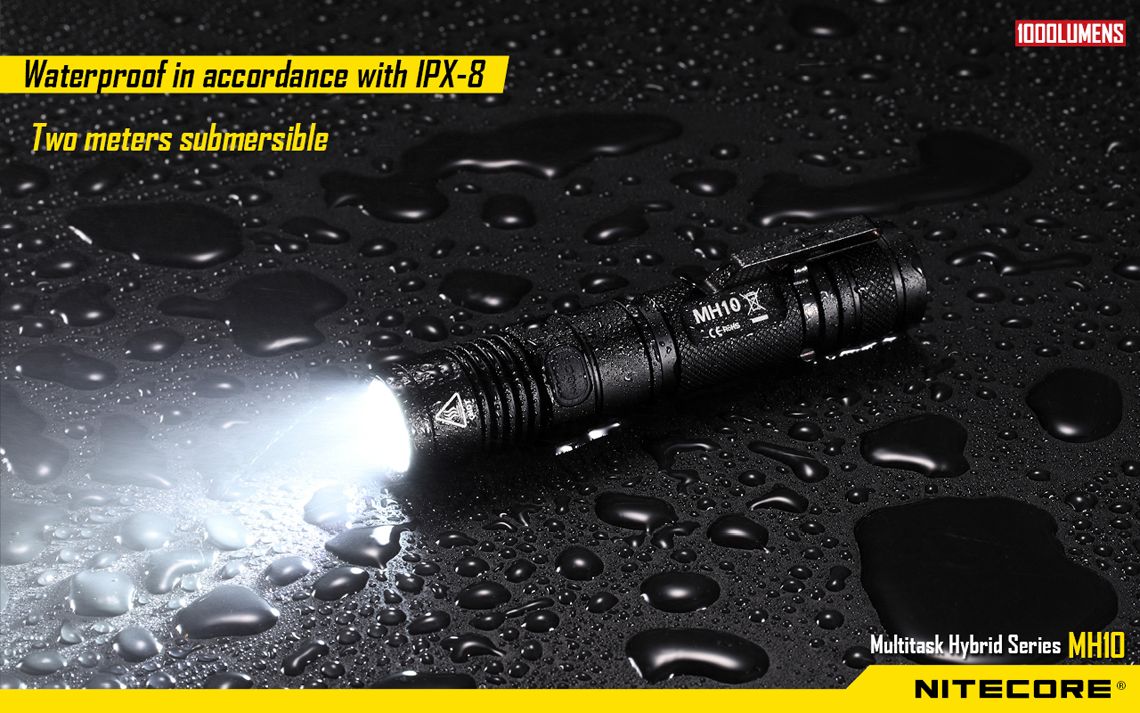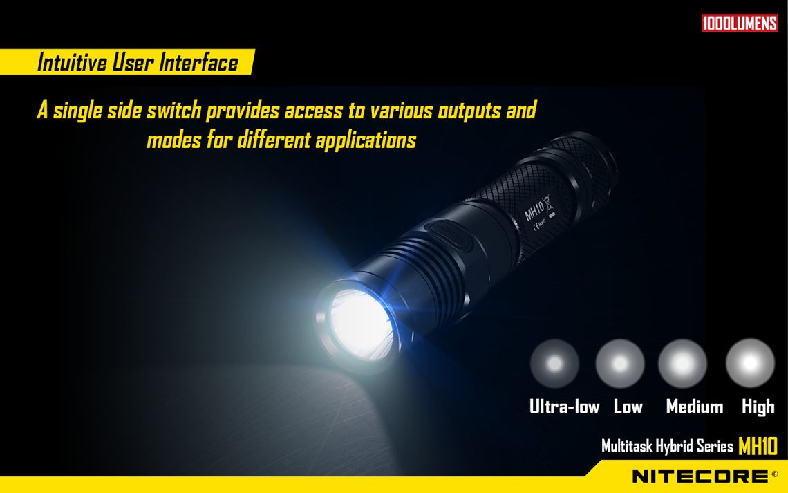 Latarka MH10 Nitecore oferuje moc na poziomie 1000 lumenów i gwarantuje zasięg do 232 metrów. Intensywność światła wynosi 13500 cd. Maksymalny czas pracy latarki przy najsłabszym trybie wynosi 520 godzin.