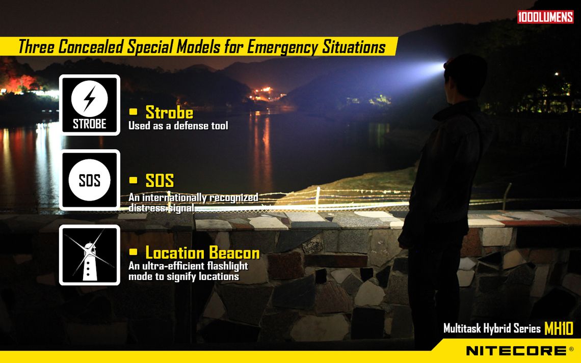 Poza czterma zwykłymi poziomami mocy, latarka oferuje również trzy tryby specjalne: Lokalizator (Beacon), Stroboskop, S.O.S.