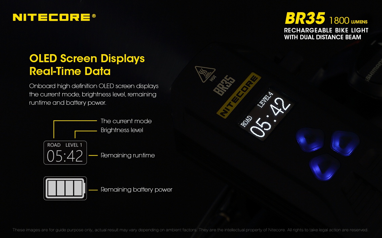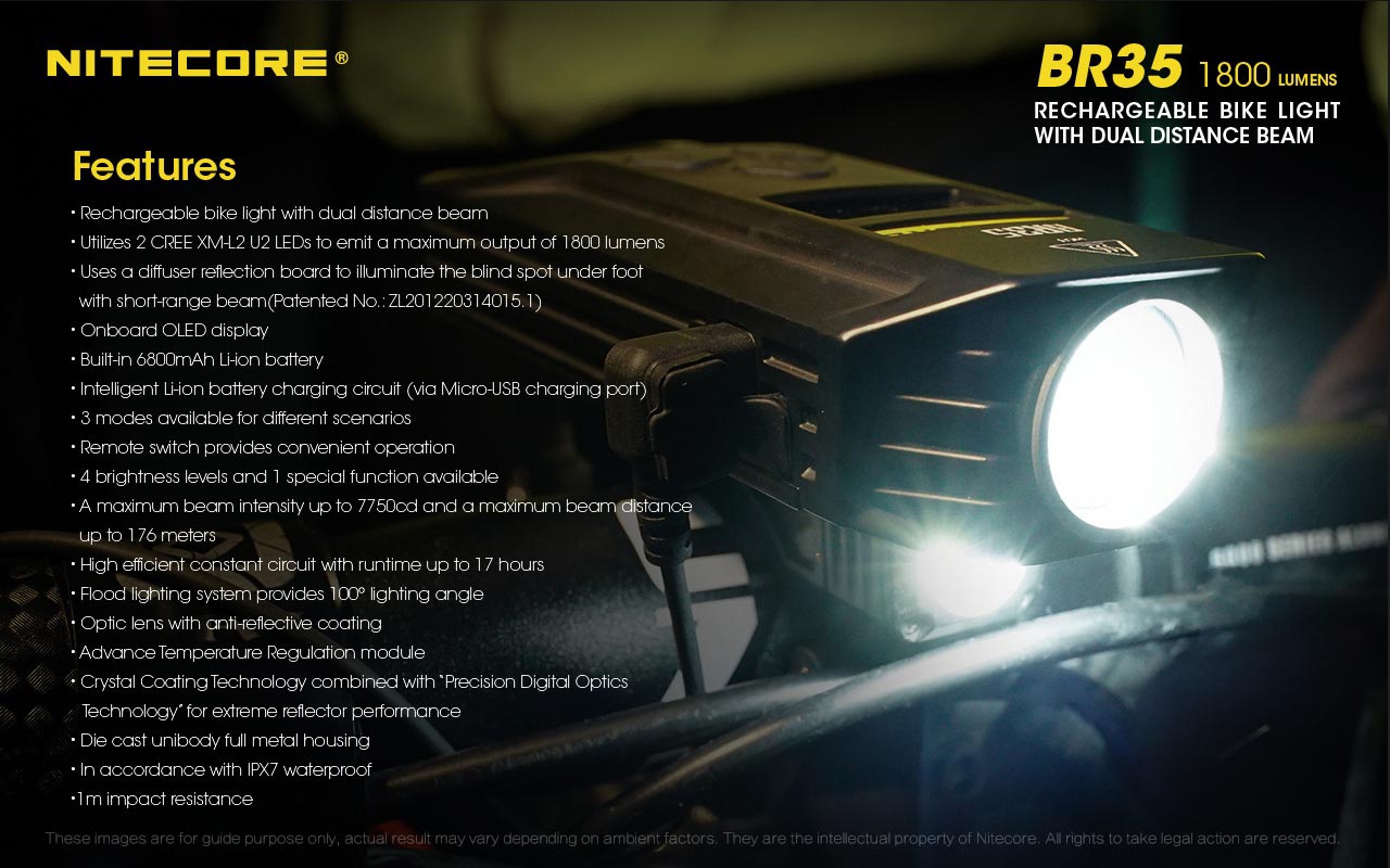 Latarka rowerowa Nitecore BR35 o mocy 1800 lumenów wyposażona w wyświetlacz OLED z możliwością ładowania i wbudowanym akumulatorem Li-ion o pojemności 6800mAh.
