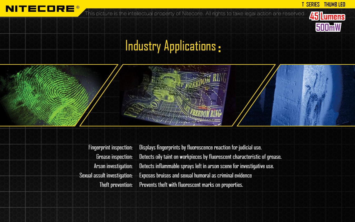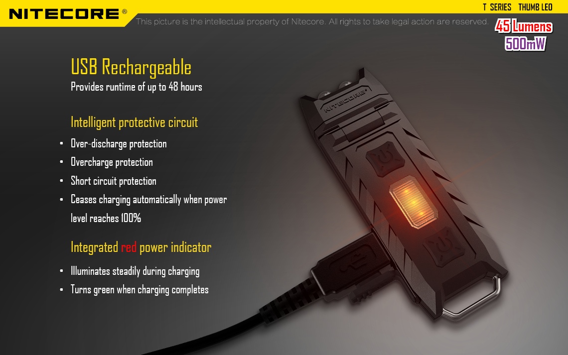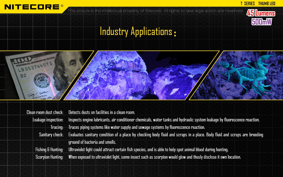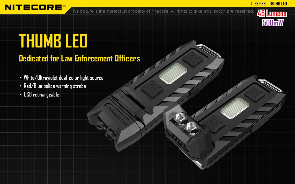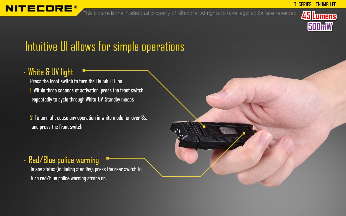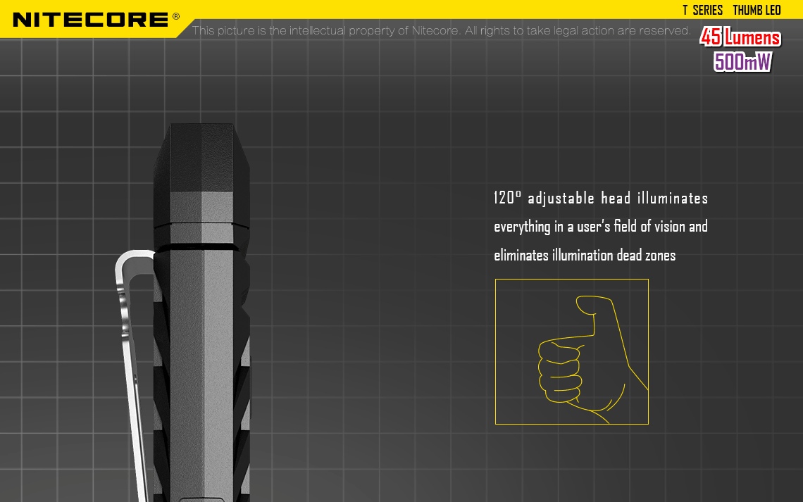 Latarka UV Nitecore Thumb posiada ruchomą głowicę (zakres ruchu: 120 stopni).