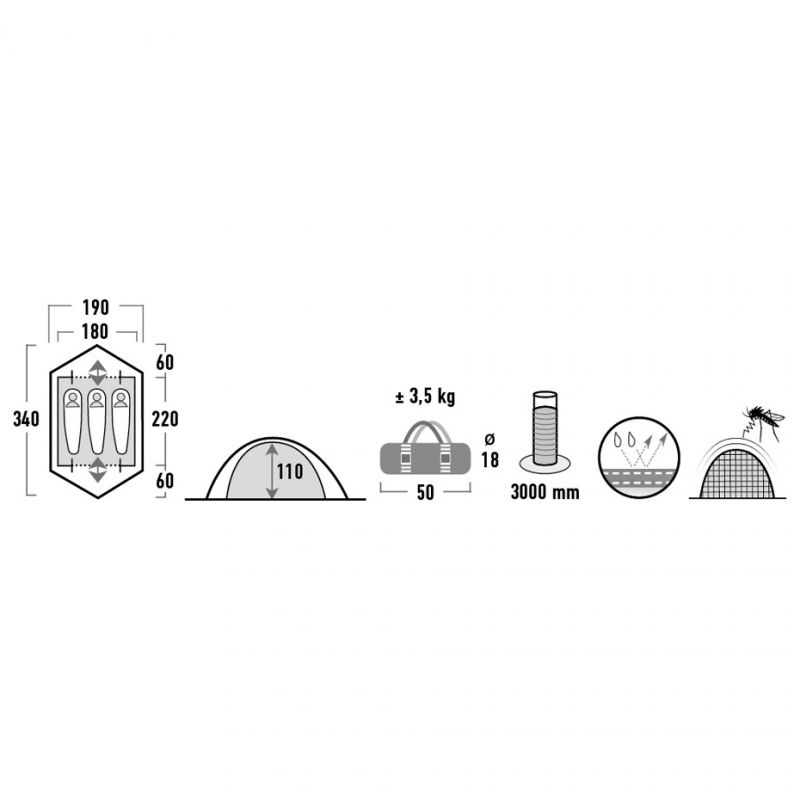 - Wymiary po rozłożeniu: 180 x 220 ( + 85 cm przedsionek )