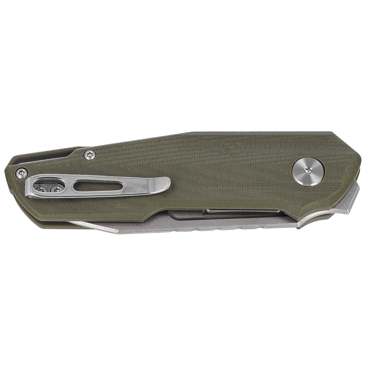 Rękojeść – zaprojektowana z myślą o pełnej kontroli i komforcie użytkowania przy zachowaniu kompaktowych rozmiarów. Okładziny z kompozytu G10 o lekkiej fakturze i matowym wykończeniu zapewniają pewny chwyt, nawet w wilgotnym środowisku. Ergonomiczne wyprofilowanie z wyraźnym podcięciem na palec wskazujący poprawia stabilność pracy przy precyzyjnych zadaniach. Na grzbiecie znajduje się frezowanie (jimping), które dodatkowo zwiększa przyczepność kciuka. Wewnętrzne stalowe linery wzmacniają całą konstrukcję i są integralną częścią systemu blokady liner lock, który pewnie utrzymuje głownię w pozycji otwartej. Klips deep carry pozwala na dyskretne przenoszenie noża w kieszeni, a otwór w tylnej części rękojeści umożliwia montaż linki zabezpieczającej. Całość uzupełnia dekoracyjny pivot z graficznym detalem – znakiem firmowym projektanta.