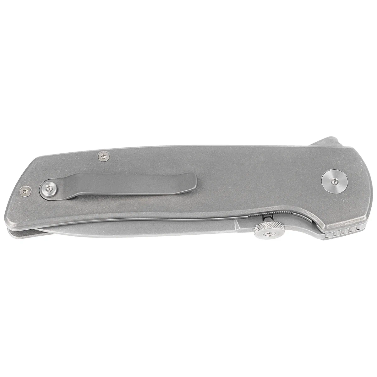 Rękojeść – fazowane okładziny z piaskowanego tytanu (Coarse Stonewashed), praktycznie niezniszczalnego metalu niewrażliwego na warunki atmosferyczne, odpornego na chemikalia i uszkodzenia mechaniczne, lekko profilowane. Masywny backspacer do którego przymocowano okładziny gwarantuje sztywność i wytrzymałość całej konstrukcji. Prosta, solidna konstrukcja daje pewność wieloletniego użytkowania. Jednopozycyjny (prawa) tytanowy klips pozwala przenosić dyskretnie nóż w kieszeni w pozycji tip-up (czubkiem ostrza do góry).