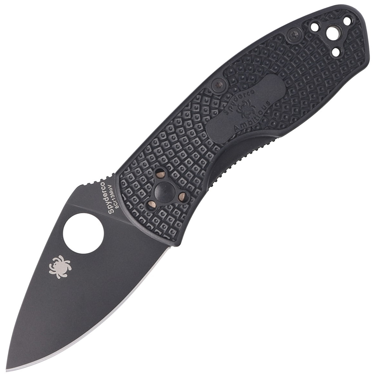 Głownia – o szerokim zakrzywionym profilu Leaf Shaped (kształt liścia), grubości 3.1 mm zapewnia doskonałą geometrię krawędzi tnącej przy niskim tarciu. Krawędź tnącą wyprowadzono szlifem pełnym płaskim (Full Flat Grind). Ostrze gładkie Plain rozciąga się na całej długości klingi, umożliwiając potężne cięcia. Klinga wykonana z dobrze trzymającej ostrość stali nierdzewnej 8Cr13MoV (odpowiednik japońskiej stali AUS-8) pokrytej czarną, antyodblaskową powłoką. Staranne umieszczenie na głowni powiększonego 14 mm okrągłego wycięcia SpyderHole (patent Spyderco) ustawia dłoń do intuicyjnego otwarcia głowni oraz jednocześnie zwiększa garb podparcia pod kciuk spine jimping. Blokowana blokadą głowni Liner-Lock, Michaela Walkera z jimped linerem.